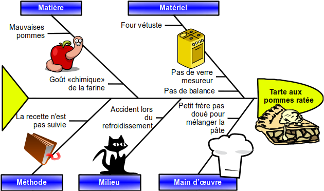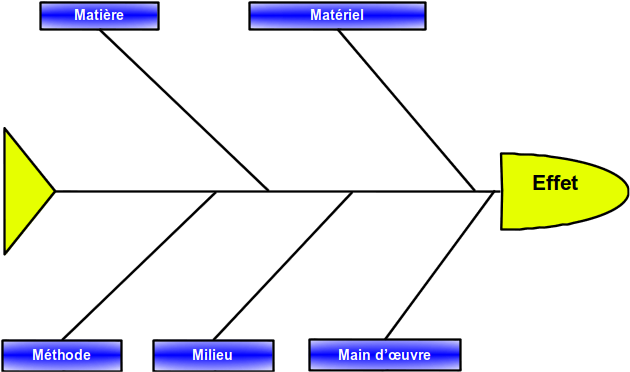 Les causes potentielles sont regroupées par familles autour des « 5M» (Main-d'œuvre, Matériel, Matière, Méthode et Milieu)