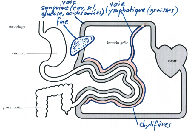 Schématiser[*] les deux voies d'absorption en complétant le schéma présenté.