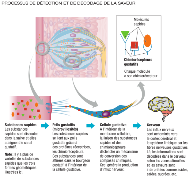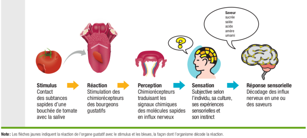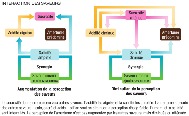Cette définition est identique à celle du goût tel que défini dans plusieurs dictionnaires. Quelle est la différence entre les deux ? Le goût comporte plusieurs sensations perçues par l'organe gustatif alors que chaque saveur ne provoque qu'une seule et unique sensation. Goût est aussi synonyme de gustation.