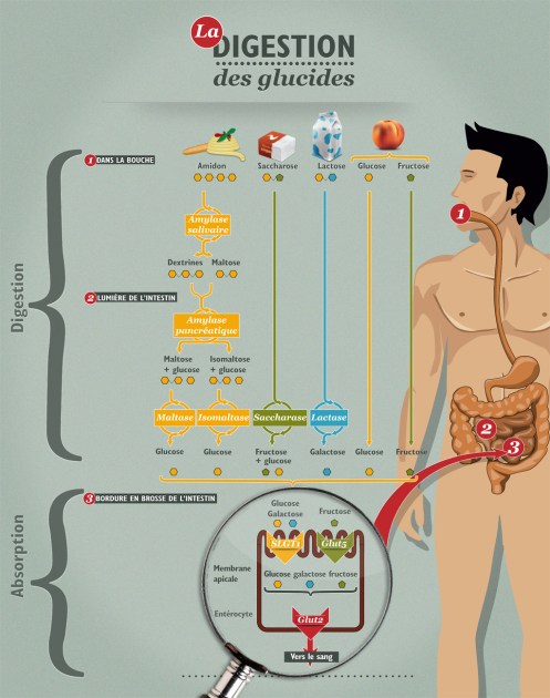 Les glucides digestibles simples et complexes subissent une succession d'étapes, au sein de notre tube digestif, qui vont les conduire à être réduits en monosaccharide (unité de base des glucides), afin de pouvoir passer dans le sang au niveau de l'intestin.