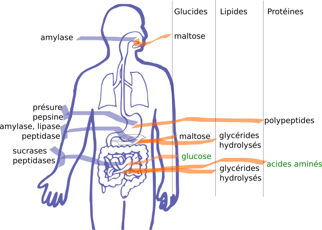Au niveau de la bouche : la digestion des glucides commence avec la mastication et l'action de l'amylase salivaire, une enzyme qui découpe ou « hydrolyse » les glucides complexes (amidon) en dextrines et maltose. L'hydrolyse de l'amidon se poursuit dans l'estomac, via l'action de cette enzyme, jusqu'à la zone où le pH devient acide et inactive l'amylase.